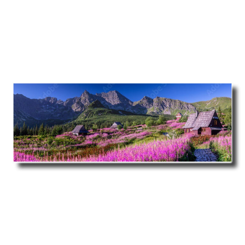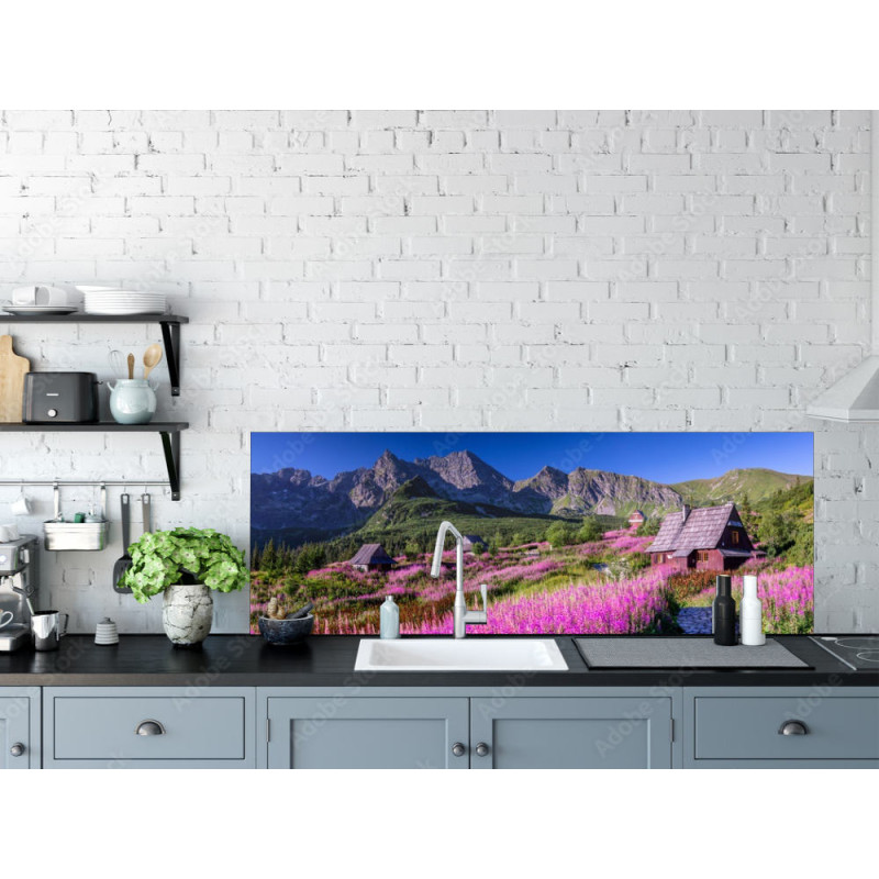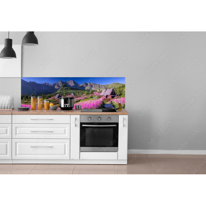 Panel kuchenny z wzorem krajobrazu górskiego w bardzo ładnej kolorystyce, tworzący wspaniały efekt w kuchni.