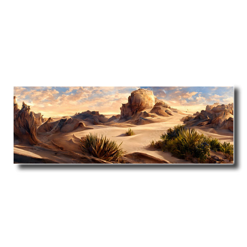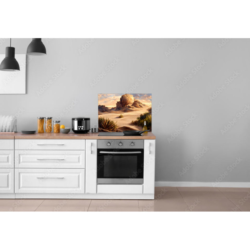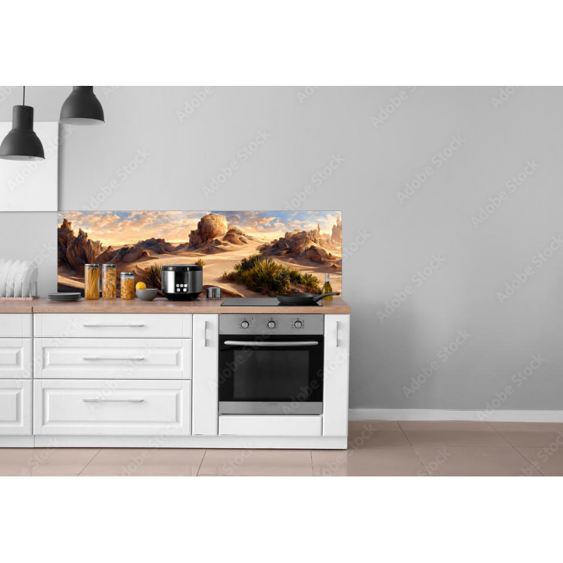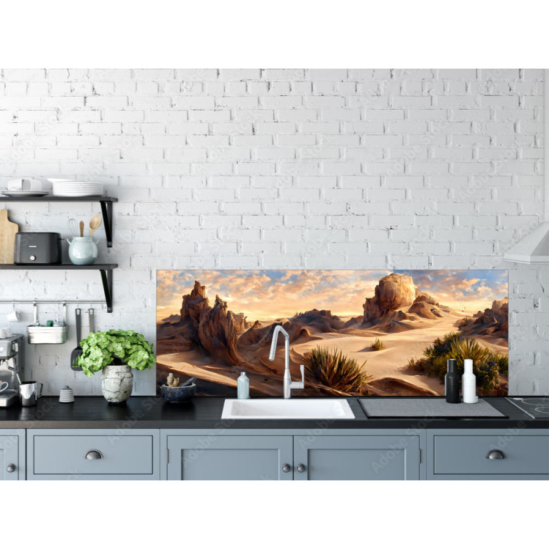 Panel kuchenny z wzorem krajobrazu pustyni z pięknymi górami, wszystko w odzieniach beżu.