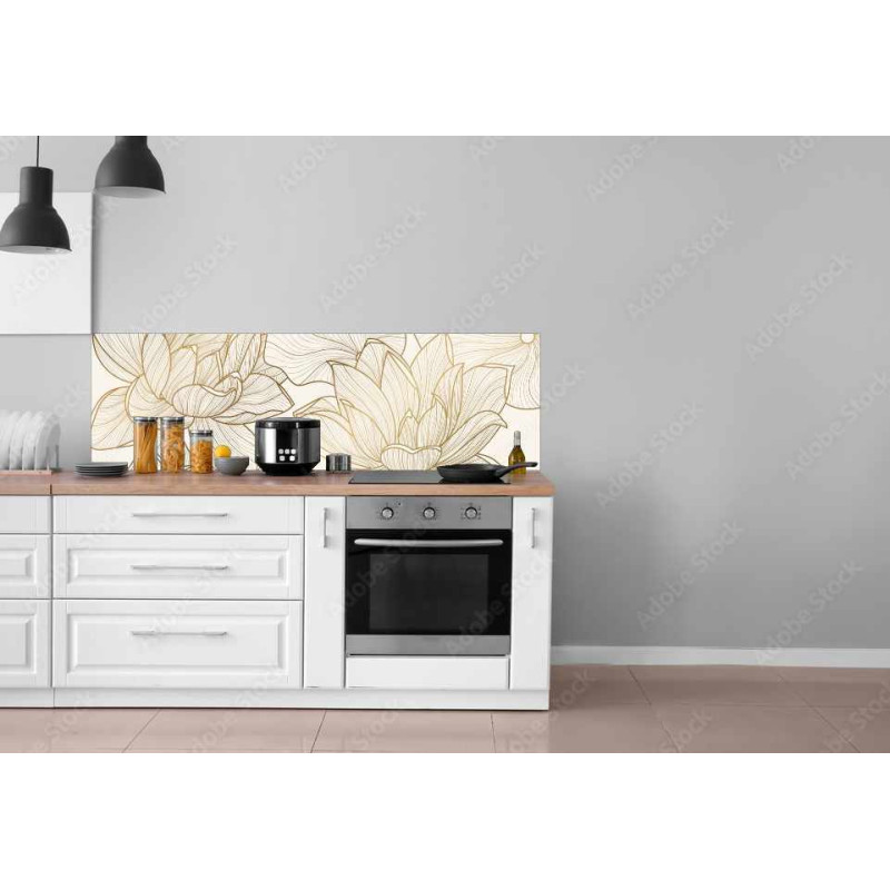 Panel kuchenny z wzorem kwiatów, kontury liści w ciemno beżowym odcieniu na jasnym tle.
