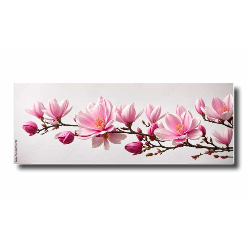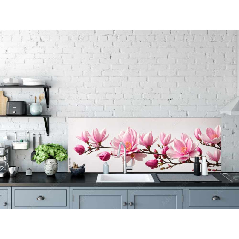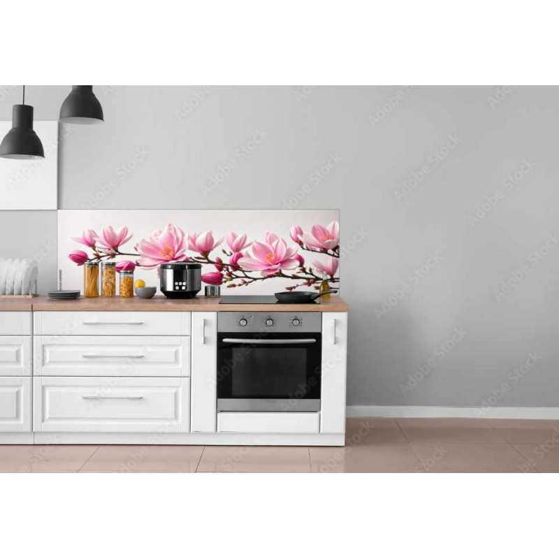 Panel kuchenny z wzorem pięknej, subtelnej, różowej magnolii na gałęzi o różnej wielkości kwiatach na jasnoszarym tle.