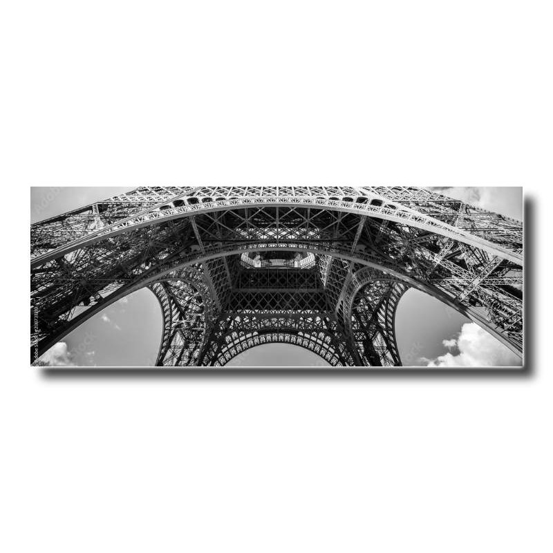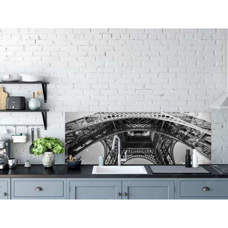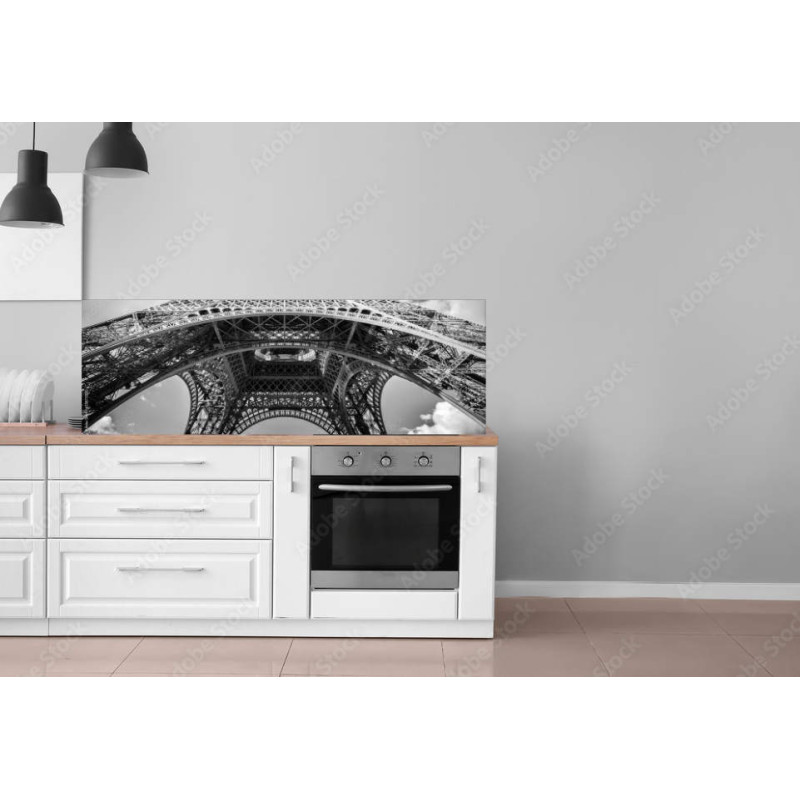 Abstrakcyjna panorama wieży Eiffla, widok od dołu, czarno-biały, Paryż, Francja