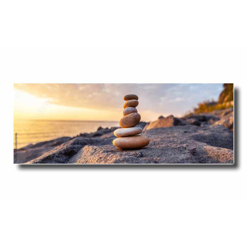 Piramida z kamieni na brzegu morza o zachodzie słońca